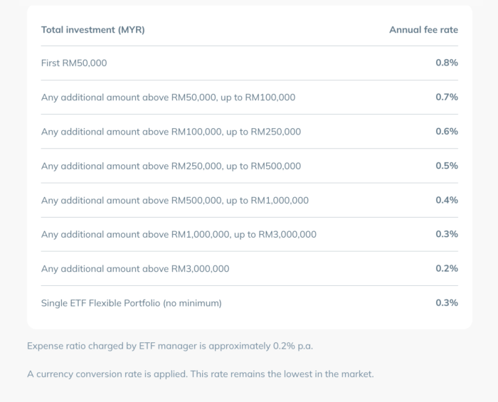 At StashAway, the approximate expense ratio across its subscribed funds is 0.2% per annum, while its foreign exchange fee is 0.35% per conversion.