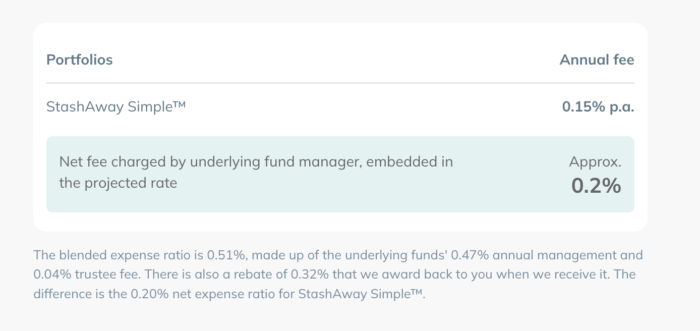 And if you’re using StashAway’s cash management portfolio, StashAway Simple, it’s free, save for the underlying funds’ (Principal Islamic Money Market and AmIncome Funds) 0.15% annual management fee: