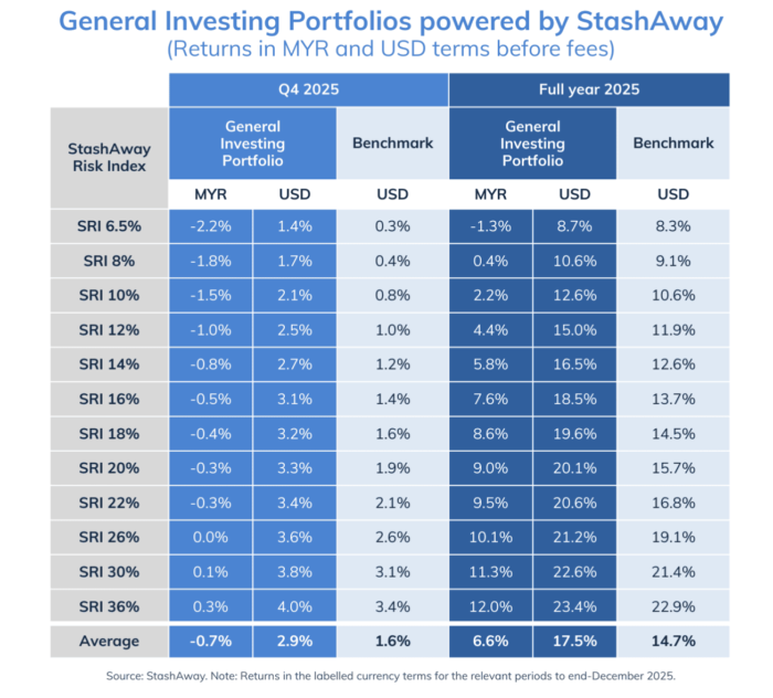 StashAway’s reported 2025 full year returns were 20.6% (in US dollars) for the 22% risk index portfolio and 23.4% for the 36% risk index portfolio — 3.8% and 0.5% higher than their benchmarks (StashAway compares the performance of their funds to that of the FTSE All World Index for equities and the FTSE World Government Bond Index for bonds).